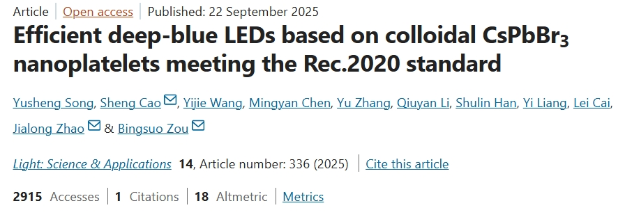 Recently, Guangxi University's nanophotonics research team made new advancements in the field of deep-blue LEDs. The findings, titled "Efficient deep-blue LEDs based on colloidal CsPbBr3 nanoplatelets meeting the Rec.2020 standard," were published in Light: Science & Applications, a subsidiary journal of Nature. The lead author is Song Yusheng, a 2023 doctoral student from the School of Physica...