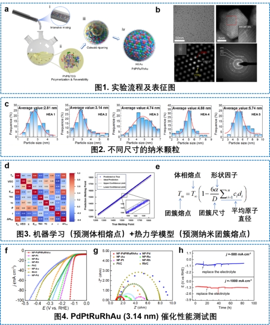 Catalyst is industrial MSG, a key raw material in chemical production, which plays an important role in improving production efficiency and reducing cost. Facing the bottlenecks in the current electrocatalytic hydrogen production technology, such as easy sintering of catalysts and deactivation of active sites, the research team proposed a design strategy for high-entropy alloys (HEAs) nanocatalysts based on the pentametals of palladium (Pd), platinum (Pt), ruthenium (Ru), rhodium (Rh), gold (Au), and other five-membered metals. Through the microreactor technology, the team realized the precise regulation of metal salt solution and reducing solvent under mild conditions (230 ℃), and successfully developed high entropy alloy nanoparticles with anti-sintering, anti-corrosion, and synergistic multiple active sites, and established a new method for size-controllable preparation.