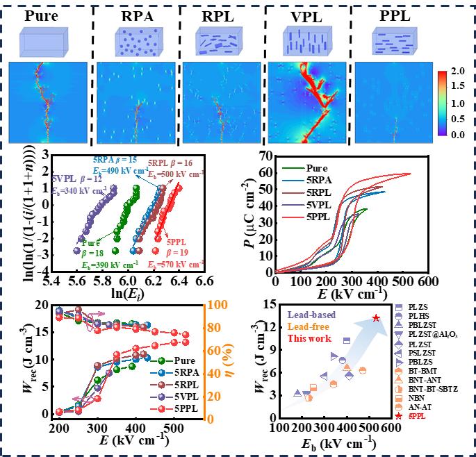 To address this challenge, inspired by the natural nacre structure, the team proposed an innovative strategy to enhance breakdown strength and energy storage density by constructing an ordered nacre-like micro-structure. They introduced high-breakdown-strength alumina (Al₂O₃) platelet templates into an antiferroelectric ceramic matrix and aligned them parallel via tape-casting technology, creating an "ordering-structured" antiferroelectric composite ceramic. The study revealed that the aligned Al₂O₃ platelets effectively hindered charge migration and electrical treeing propagation, increasing the composite's breakdown strength by 1.5 times. This unique microstructure enabled an ultrahigh energy storage density of 13.2 J/cm³, significantly surpassing conventional ceramics. The research provides a novel approach for designing high-performance dielectric ceramics for energy storage capacitors.