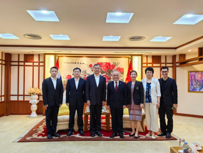Minister Wu Zhiwu and Counselor Xu Lan of the Chinese Embassy in Thailand received the delegation, and listened to Mr. Han Linhai's report on talent cultivation, academic research, cultural exchanges, and other issues between Guangxi University and Thai universities, government sectors and scientific institutions. They fully affirmed the internationalized development strategy of Guangxi University of "Deeply Cultivating ASEAN and Facing the World" and the outstanding achievements of GXU in serving China-ASEAN development. They expressed that they would strongly support GXU to carry out education and teaching for foreign students in Thailand, the construction of Confucius Institute at Suphanburi and cultural exchanges between China and foreign countries, and also hoped that Guangxi University would continue to serve the construction of the "the Belt and Road" and the overall diplomatic situation of the country. Han Linhai stated that Guangxi University would carry out deeper exchanges and cooperation with Thailand in education, science and technology, culture, talent exchange and other fields based on its own characteristics and advantages, striving to make new breakthroughs in standardization, regional technology and socio-economic development, and contribute wisdom and strength to the construction of a closer China-ASEAN community with a shared future.