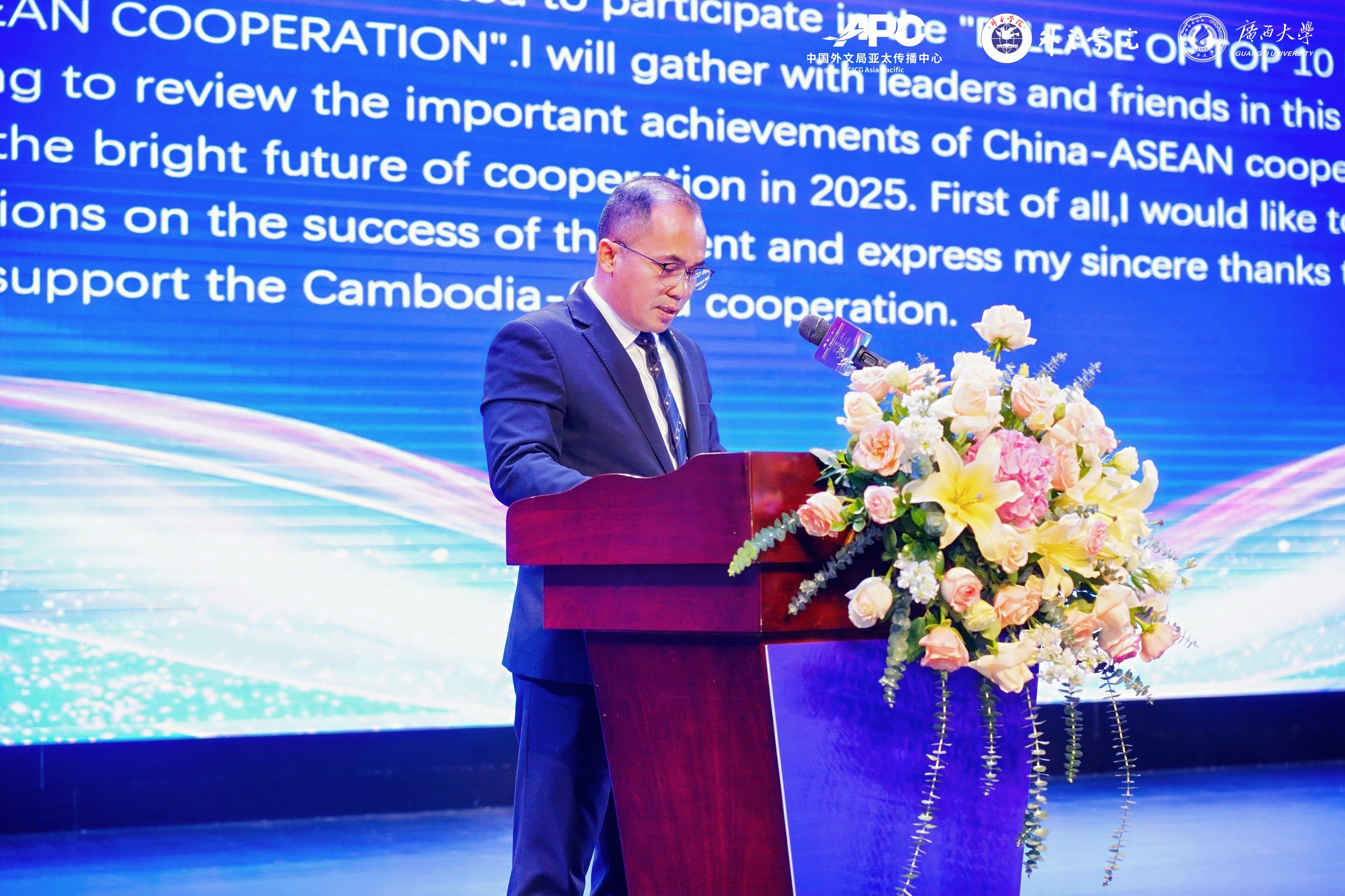 On February 27, under the guidance of China International Communications Group(CICG), China Foreign Affairs University, and the Publicity Department of the CPC Guangxi Zhuang Autonomous Region Committee, the “Top Ten News Stories on 2024 China-ASEAN Cooperation” release event was co-hosted by the CICG Asia-Pacific , the Institute of Asian Studies of the China Foreign Affairs University, and Guangxi University. The event was organized by the China-ASEAN Research Institute, Research Institute for Innovation and Development and the China-ASEAN School of Economics at Guangxi University. Li Guozhong, Secretary of the Party Committee of Guangxi University , attended the event and delivered a welcome speech. Xia Guoen, Member of the Standing Committee of the Party Committee and Vice President of Guangxi University, hosted the event. Gao Anming, Editor-in-Chief of the China International Communications Group (CICG); Li Pan, Deputy Director of the Publicity Department of the CPC Guangxi Zhuang Autonomous Region Committee; Taing Sokngorn, Consul General of Consulate General of Cambodia in Nanning; Gao Fei, Vice President of the China Foreign Affairs University, and Liang Yiguang, Deputy Secretary-General of the China-ASEAN Expo Secretariat, attended the event and delivered speeches.