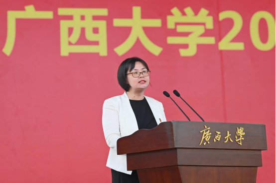 Thay mặt đội ngũ giáo viên, Phó Giám đốc Viện Đào tạo Sau đại học, giáo sư Học viện Kỹ thuật Điện Lê Tĩnh Hoa đã chia sẻ những kinh nghiệm và suy nghĩ trên con đường nghiên cứu khoa học của mình với câu “Kế thừa và đổi mới, dùng động lực kép để cùng nhau tạo ra một tương lai tươi đẹp” trong bài phát biểu, mong rằng các bạn sinh viên có thể học cách khám phá và cảm nhận, tiếp thu và biến đổi, kế thừa và đổi mới vẻ đẹp của nhà trường, lập ý chí cao cả, học tập chăm chỉ, phát triển toàn diện và chăm chỉ trải nghiệm mỗi tiết học, mỗi buổi trao đổi và mỗi chương trình, biến tinh hoa trí tuệ của Đại học Quảng Tây thành kho tàng kiến thức và khả năng của cá nhân, dũng cảm phá vỡ quy tắc thường lệ, tận dụng tốt các nền tảng và cơ hội như các dự án nghiên cứu khoa học, hội nhập khoa học - giáo dục và hội nhập ngành nghề - giáo dục... chuyển hóa kiến thức và kỹ năng đã học thành hành động thực tế thúc đẩy tiến bộ xã hội và đóng góp vào sự phát triển của xã hội.