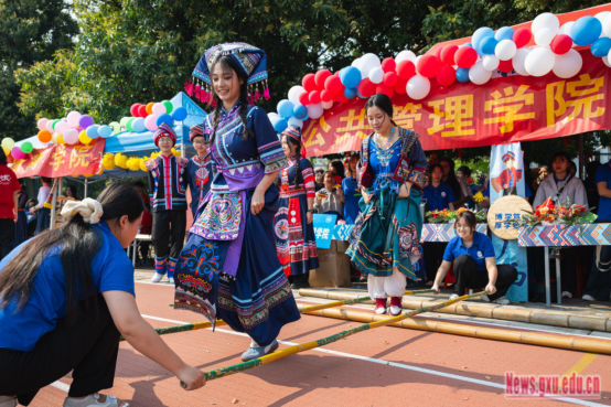 Các em học sinh mặc trang phục dân tộc lộng lẫy nhảy múa nhịp nhàng giữa những cây sào tre, thể hiện nét quyến rũ của dân tộc. Biểu diễn múa lân đan xen với múa rồng cùng nhau chào mừng lễ hội "Mồng 3 tháng 3" và giành được tràng pháo tay vang dội. Với giai điệu vui tươi của bài hát Dân ca Hạnh phúc, hàng trăm em học sinh mặc trang phục dân tộc cùng nhau nhảy múa, tái hiện lại cảnh sống hạnh phúc của người dân các dân tộc và thể hiện sức mạnh đoàn kết dân tộc!