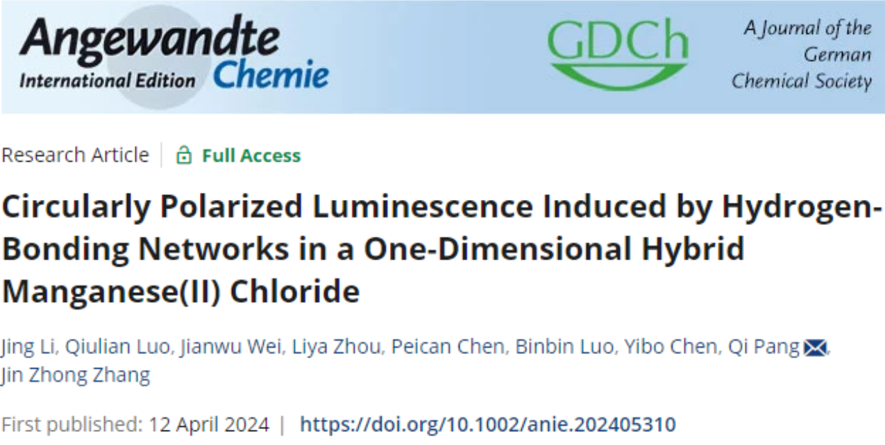 Recently, the Photoelectric Functional Materials team at our university's School of Chemistry and Chemical Engineering achieved a significant breakthrough in the field of organic-inorganic hybrid manganese halide Circularly Polarized Luminescence (CPL). The research findings were published in Angewandte Chemie International Edition, a prestigious international journal in the chemistry field. The paper titled "Circularly Polarized Luminescence Induced by Hydrogen-Bonding Networks in a One-Dimensional Hybrid Manganese(II) Chloride" was authored by Li Jing, a doctoral candidate from the School of Chemistry and Chemical Engineering graduating in 2020. Professor Pang Qi from the same school served as the first corresponding author. Additionally, Guangxi University is acknowledged as the primary affiliation for this publication.