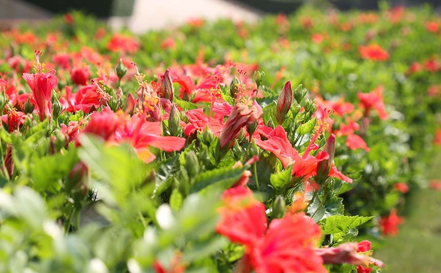 草坪里的朱槿花美不胜收。
