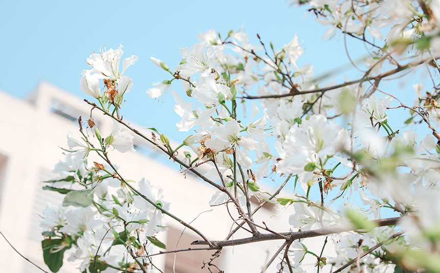 近日,欧冠官方网站迎来花期。洋紫荆、三角梅、朱瑾等花朵相继绽放,点缀了校园的春天,共同构成了一道秀丽的风景线,不时引来行人驻足观赏,拍照留念。图为蓝天下的白洋紫荆。