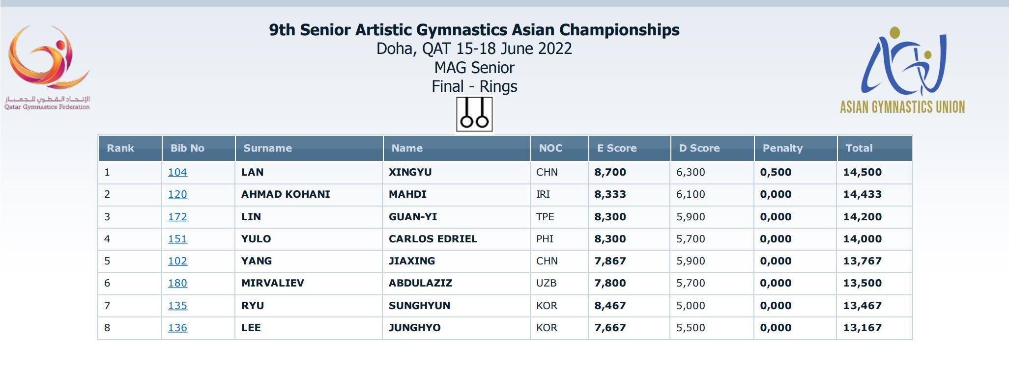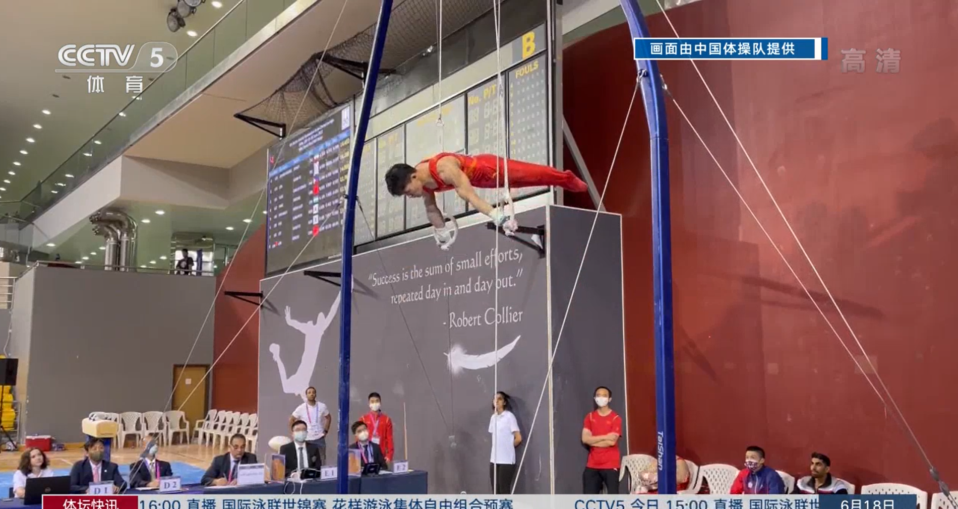 男子吊环决赛,中国选手兰星宇(欧冠体育学院学生)以14.500分摘金,另一位中国选手杨家兴得到13.767分,最终排名第五。
