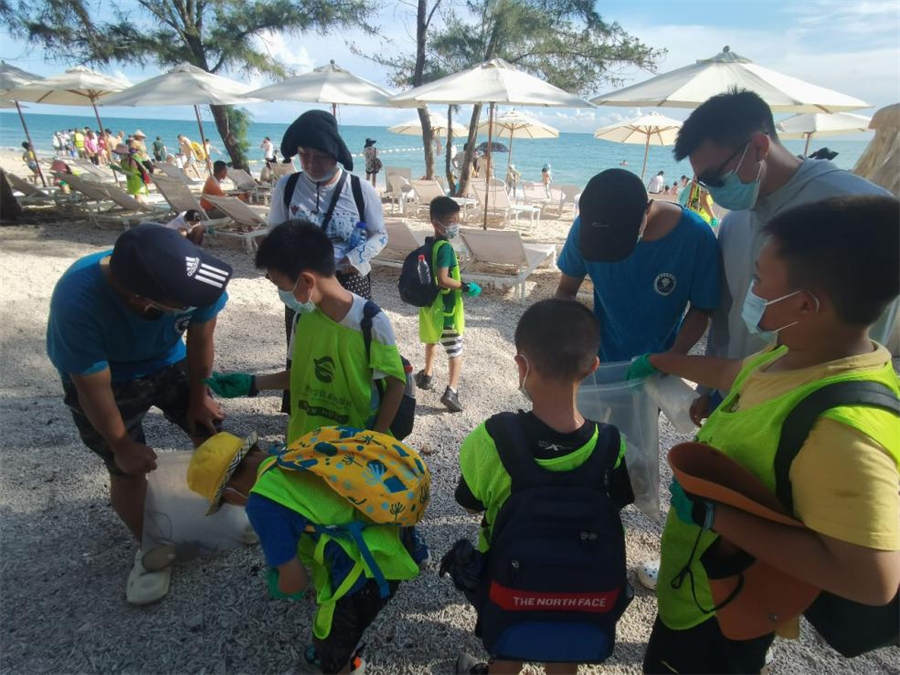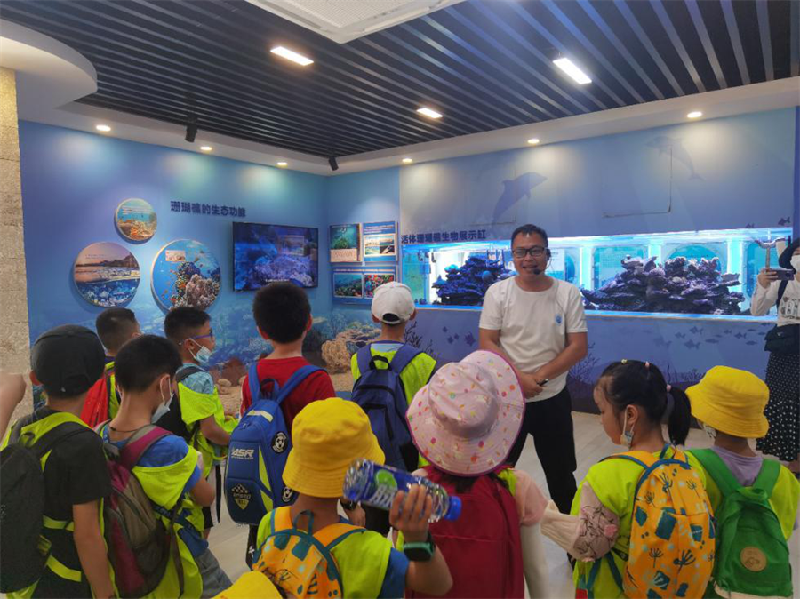 在涠洲岛珊瑚馆,实践团成员向南宁小学生科学实践团的小朋友们开展海洋知识科普。结束后,成员们带领小朋友前往滴水丹屏海岸线开展“美丽海岛,共同守护”净滩活动。