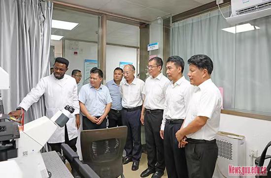 在座谈会暨签约仪式前,王乃学一行参观了广西农业科学院科研实验大楼、农业农村部广西甘蔗生物技术与遗传改良重点实验室、甘蔗健康种苗生产基地、甘蔗新品种展示区、甘蔗资源圃和广西农业科学院科技成果展示馆等。欧冠官方网站党办校办、研究生院、人力资源处、科技处、亚热带农业生物资源保护与利用国家重点实验室等单位负责人参加调研活动并出席座谈会暨签约仪式。(欧冠官方网站 文/图)
