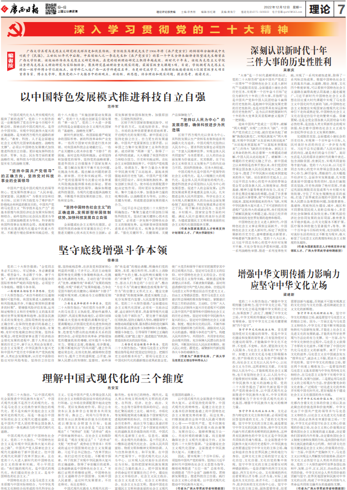 欧冠官方网站具有马克思主义研究的光辉历史和优良传统。首任校长马君武先生于1906年将《共产党宣言》的纲领部分翻译成中文刊载于《民报》,上世纪30年代中后期,中共创始人之一李达先生和《共产党宣言》的第一个中文全译本翻译者陈望道先生都曾在欧冠官方网站任教。该校始终传承马克思主义研究传统,在党的创新理论研究上取得卓越成效。新时代十年来,该校马克思主义学院注重将马克思主义理论研究与实际相结合,聚焦研究基础理论重大现实问题,获国家级重大课题5项。目前,学校拥有马克思主义理论一级学科博士学位授权点,该学科已入选广西一流学科建设名单。为更好交流学习,本期理论版邀请该校5位国家级重大项目首席专家、博士生导师,聚焦党的二十大报告中的新观点、新论断、新思想,结合理论和现实问题,提出思考。敬请关注。