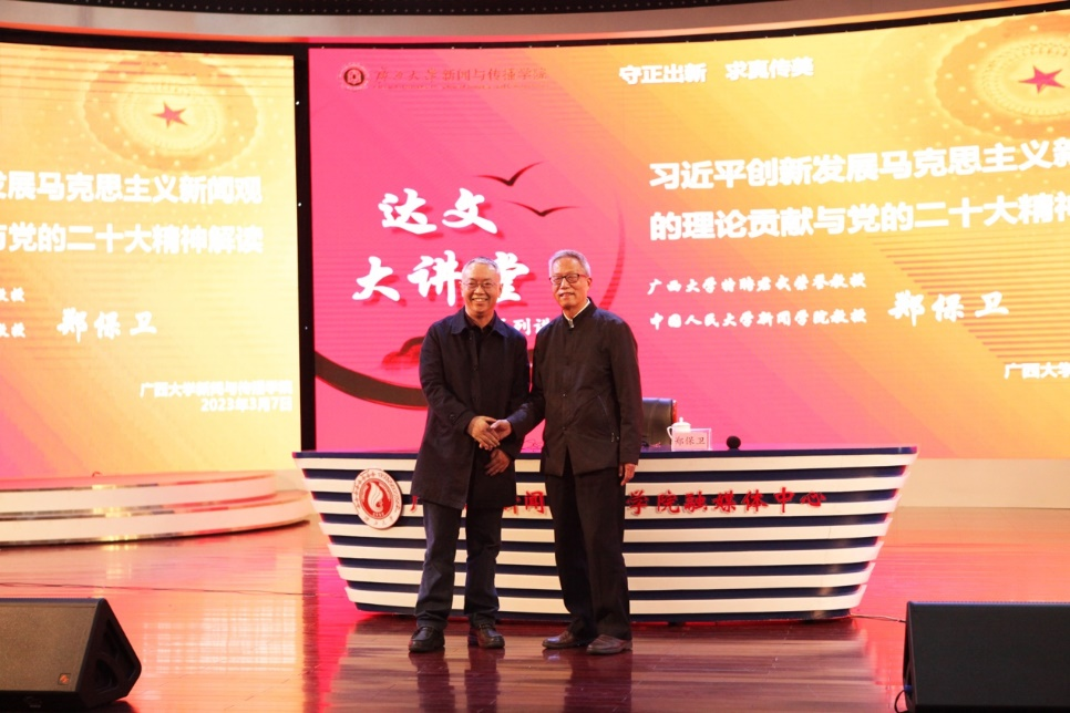 讲座由院长王仕勇主持。王院长说,2017年郑保卫教授担任学院院长以来,带领西大新传人主动服务广西经济社会发展和国家总体战略,扎实开展教书育人工作和学科建设工作,近五年获批国家社科基金重大项目、重点项目、一般项目等11项,学院在马克思主义新闻观、民族文化传播、气候与健康传播、中国-东盟区域传播等领域凸显特色。王院长介绍,“达文大讲堂”,是学院计划建成的品牌性学术活动,旨在致敬历史、筑梦未来,进一步浓厚学术氛围,凝练学科方向,产出优秀成果。