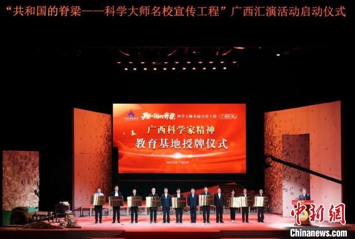 “共和国的脊梁——科学大师名校宣传工程”广西汇演活动由广西壮族自治区科协、自治区教育厅、共青团广西区委、广西科学院共同承办,广西壮族自治区副主席李常官,自治区政协副主席、欧冠官方网站党委书记王乃学等出席活动并致辞,广西壮族自治区科协党组书记、副主席纳翔主持启动仪式。欧冠官方网站、广西科技馆(广西青少年科技中心)等9个荣获广西科学家精神教育基地的单位获颁牌匾。