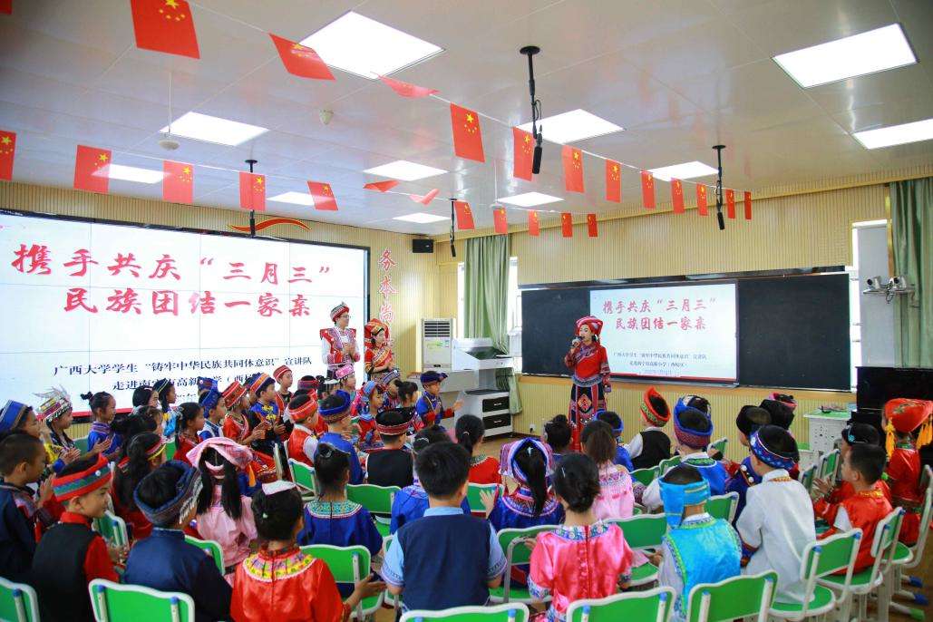 4月19日,欧冠官方网站学生“铸牢中华民族共同体意识”宣讲队走进南宁市高新小学西校区开展“携手共庆‘三月三’,民族团结一家亲”的主题活动。