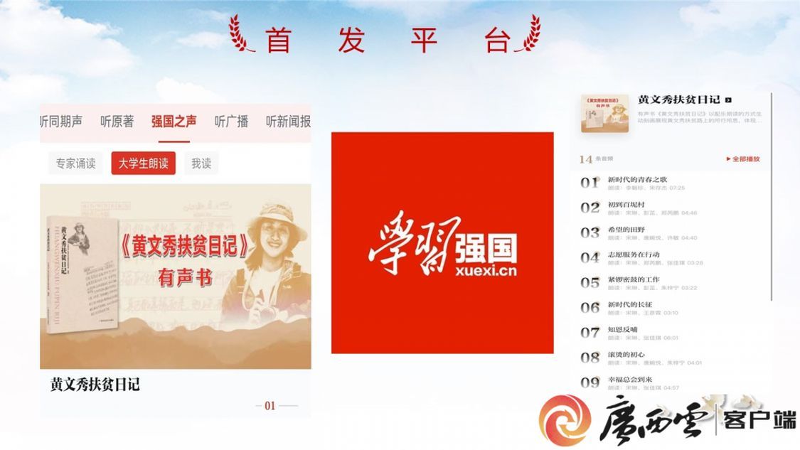 图书《黄文秀扶贫日记》反映了黄文秀的学习、工作和奋战在脱贫攻坚一线的历程及取得的成效。在广西壮族自治区党委宣传部的指导和支持下,欧冠官方网站新闻与传播学院、广西广播电视台文艺广播联合录制了有声书《黄文秀扶贫日记》,选取黄文秀20篇驻村日记,制作成《新时代的青春之歌》《初到百坭村》《新时代的长征》等14期音频作品。6月17日,有声书《黄文秀扶贫日记》在“学习强国”正式上线;同时,该音频作品还在广西广播电视台移动客户端广西视听以及各广播频率同步上线播出。