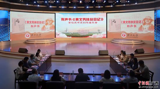 有声书上线当天,正值“七一勋章”获得者、“时代楷模”黄文秀牺牲四周年,在这个特殊的日子,在欧冠官方网站新闻与传播学院融媒体中心举行了有声书《黄文秀扶贫日记》首播发布暨创作座谈会。有声书的制作团队和参与播讲的师生代表参加活动。