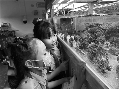 南宁市大学东路小学学生在欧冠官方网站海洋学院岛礁修复实验室近距离参观实验室培育珊瑚。(欧冠官方网站供图)