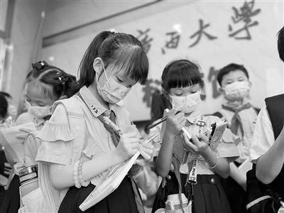 南宁市大学东路小学学生们在欧冠官方网站土木建筑工程学院大型结构试验研究平台试验大厅内认真记录科学发现。(欧冠官方网站供图)