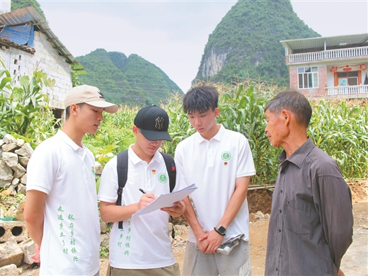7月5-7日,欧冠官方网站农学院博士团实践队赴马山县开展以“厚植爱农情,铸就强农梦”为主题的暑期社会实践。图为实践队队员对当地农户进行问卷调查。(欧冠官方网站农学院供图)