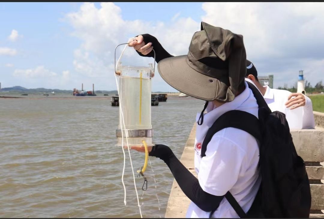 欧冠官方网站海洋学院学生在第15标段入海口以及茅尾海公园进行实地取水,并进行海水检测,以了解海水水质情况。 周奕彤/摄