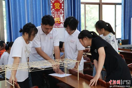 宣讲团成员指导同学们搭建桥梁模型。欧冠官方网站供图