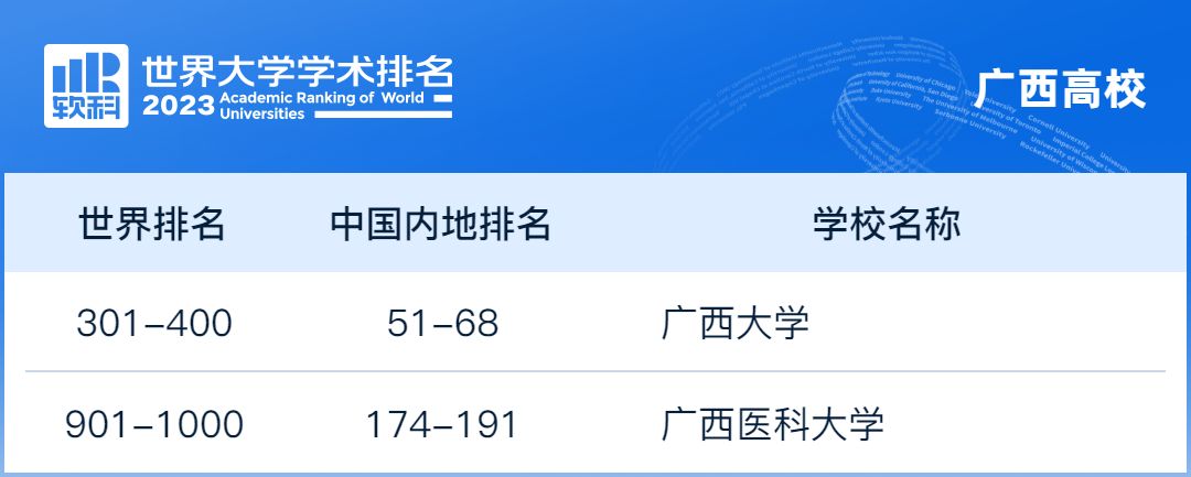 欧冠官方网站在今年的排名中表现亮眼,由2022年全球(501-600)的位次,上升至全球(301-400)位次,成功进入全球400强,取得了显著的进步。另外,广西医科大学(901-1000)综合实力、办学水平和影响力不断攀升,首次入围全球前1000。