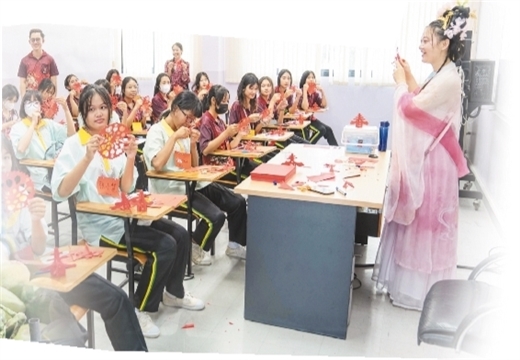 素攀孔子学院的志愿者教师吴琰琴带领学生感受精巧的中国剪纸技艺。