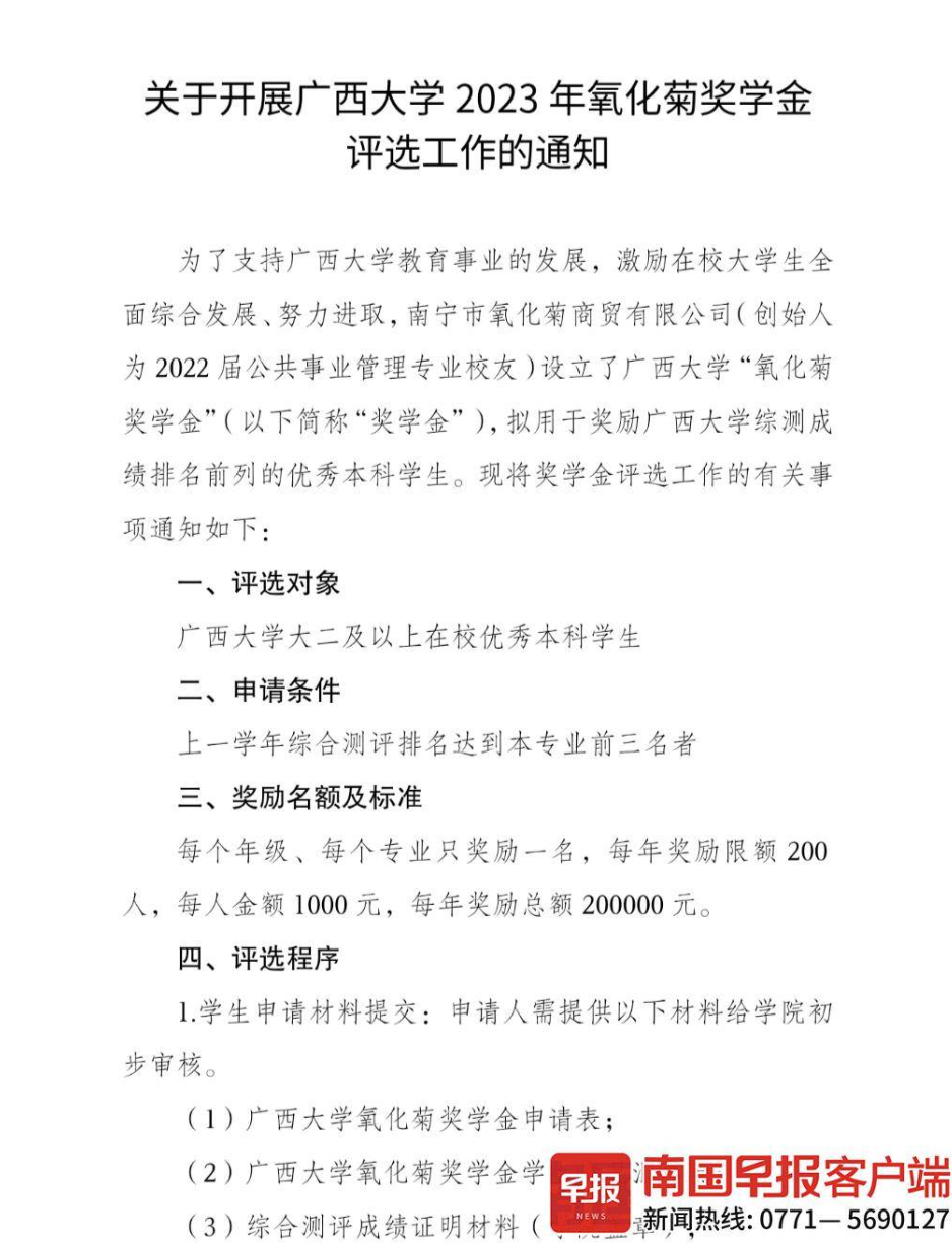 回校设立奖学金,一方面是为了感恩、回馈母校,另一方面则是希望鼓励学弟学妹们全方位发展。她设立的是欧冠官方网站第一个以综测排名为评选标准的奖学金,每年20万元奖励200名优秀本科生,另外20万元用于图书馆插座改造项目。▲氧化菊奖学金评选通知。图源欧冠官方网站