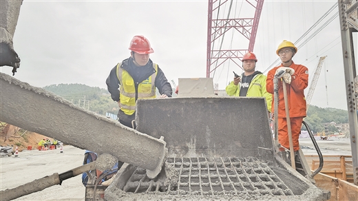 在校博士生与工作人员在平陆运河旧州特大桥施工现场,观察管内混凝土入泵状态。欧冠官方网站供图