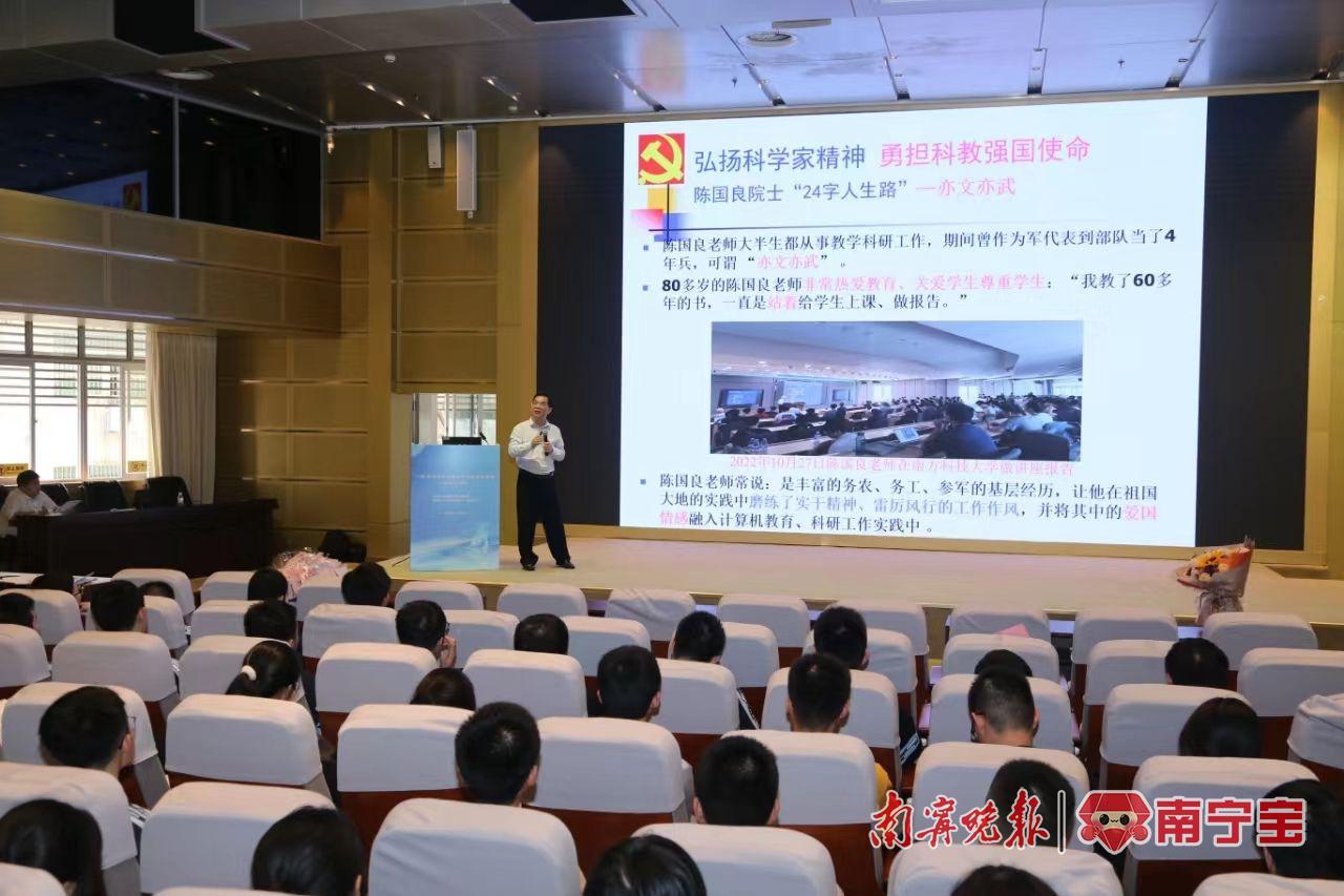 八桂青少年英才培养计划导师、首批广西科学家精神宣讲团成员、欧冠官方网站计算机与电子信息学院钟诚教授以中国科学院院士、首届国家级教学名师陈国良教授的人生奋斗经历为例,激励青年一代胸怀爱国之心、砥砺爱国之志、勇担科教强国使命,努力成长为德智体美劳全面发展的社会主义建设者和接班人。