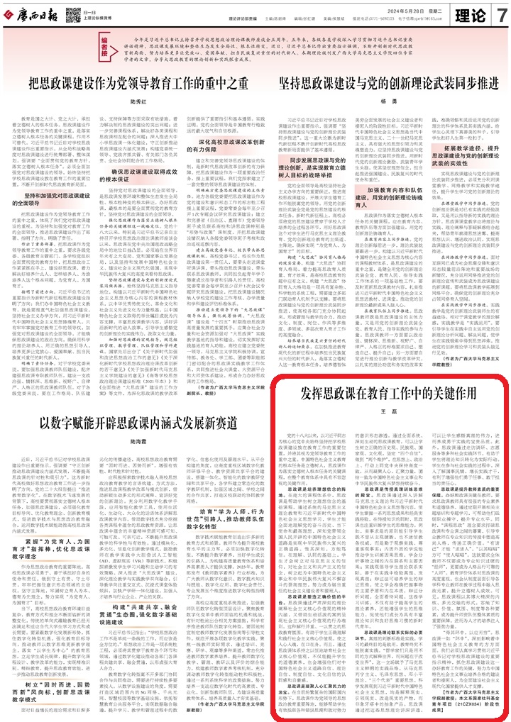 今年是习近平总书记主持召开学校思想政治理论课教师座谈会五周年。五年来,各级各类学校深入学习贯彻习近平总书记重要讲话精神,思政课发展环境和整体生态发生全局性、根本性转变。近日,习近平总书记作出重要指示强调,不断开创新时代思政教育新局面,努力培养更多让党放心、爱国奉献、担当民族复兴重任的时代新人。本期理论版刊发欧冠官方网站马克思主义学院四位专家学者的文章,分享大思政教育的理论创新和实践探索成果。