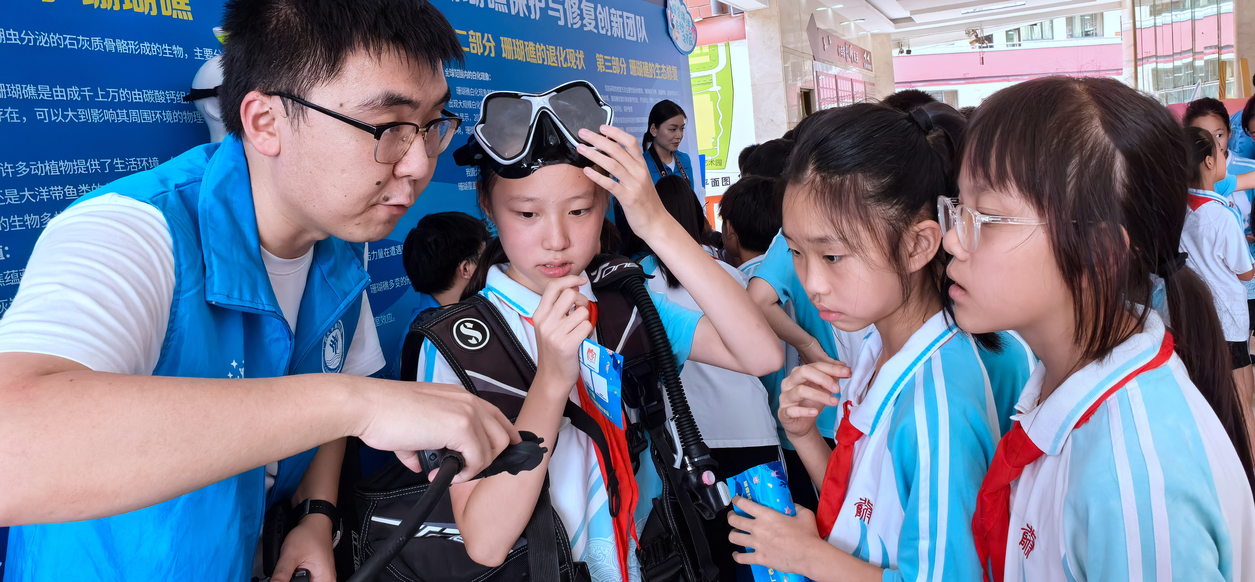 欧冠官方网站海洋学院珊瑚礁保护与修复展区潜水体验吸引了学生们。