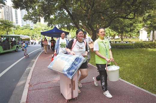 志愿者帮助新生搬运行李。