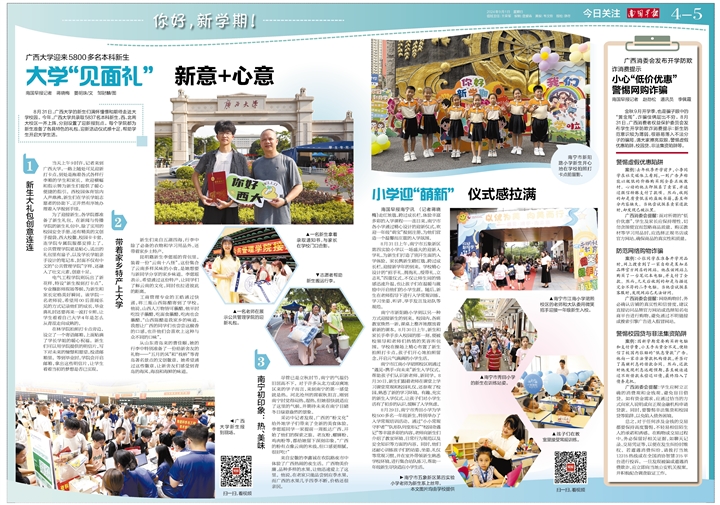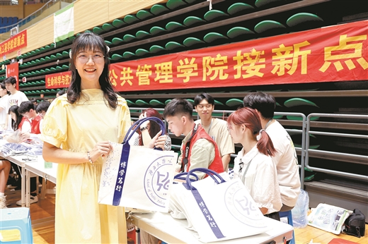 为了迎接新生,各学院都准备了新生礼包。在新闻与传播学院的新生礼包中,除了实用的校园安全手册,还有精美的文创手提袋、西大校徽、校园卡卡套,连学院专属院服都安排上了。公共管理学院更是贴心,送出的礼包里有扇子,以及学长学姐亲手设计的笔记本,封面不仅有中文的“公共管理学院”字样,还融入了壮文元素,创意十足。