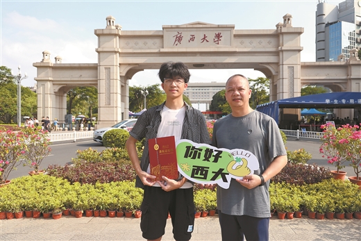 一名新生拿着录取通知书,与家长在学校门口合影。