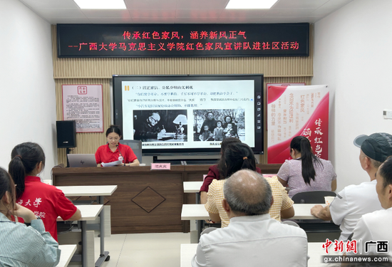 为助力营造家庭文明新风尚,让红色家风在基层社区“生根发芽”,9月12日,欧冠官方网站学生红色家风宣讲队走进南宁市西耐路社区,开展以“传承红色家风,涵养新风正气”为主题的红色家风宣讲活动。西耐路社区党群服务中心工作人员和社区党员代表参加活动。