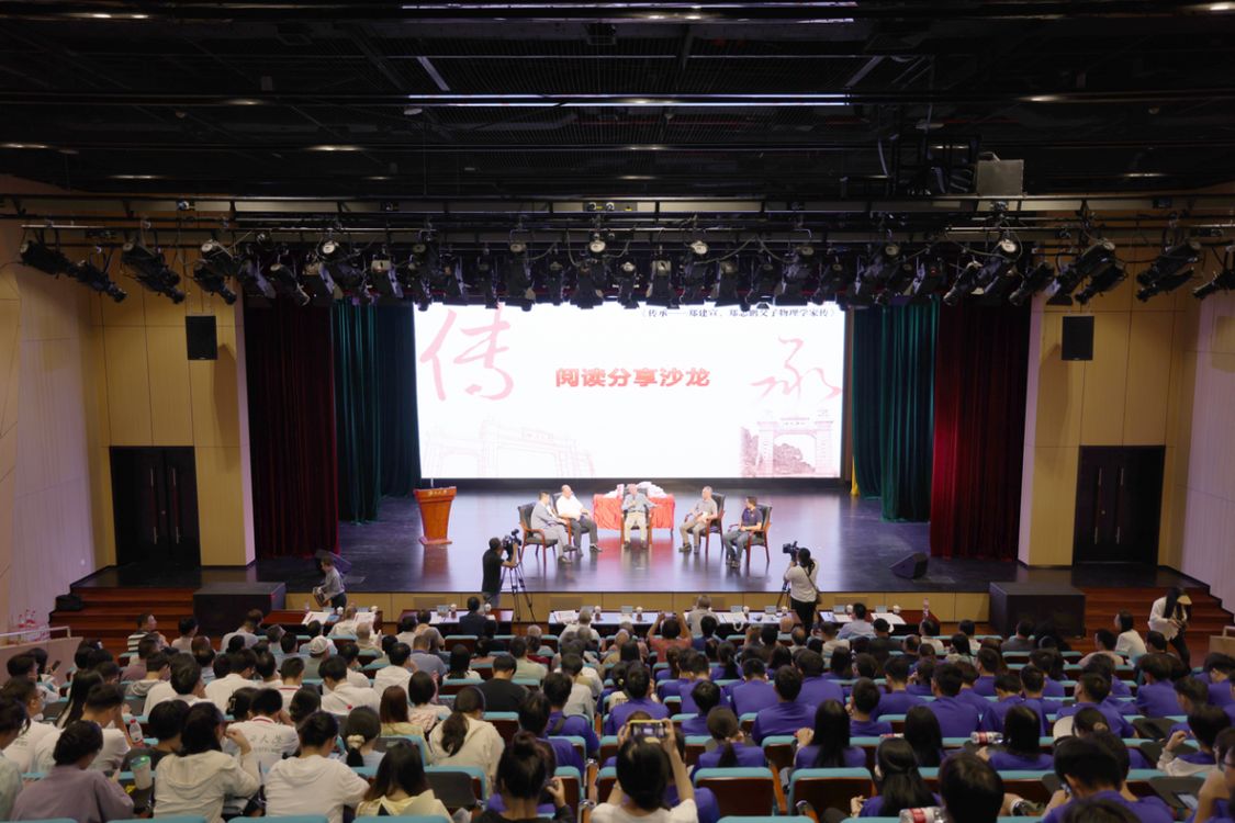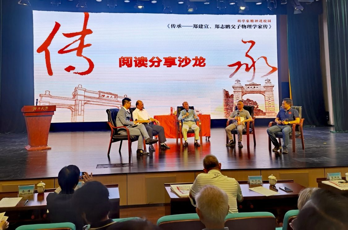 新书阅读分享沙龙环节,郑志鹏老校长,郑建宣校长学生代表、广西科学院原党组书记兼院长、欧冠官方网站原副校长钟夏平,郑志鹏校长学生代表、欧冠官方网站物理科学与工程技术学院副院长刘宏邦,《传承》作者代表、香港文汇报广西联络处原主任、大公报广西办事处原主任罗保华,上台做交流分享。他们围绕书籍分享了各自的观点,让大家更加深入地了解了郑建宣、郑志鹏父子的科学人生和科学家精神。
