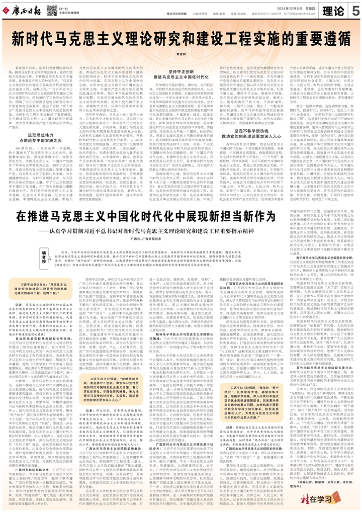 广西医科大学马克思主义学院党委书记陈会方:习近平总书记的重要指示体现了对马克思主义理论研究和建设工程地位和作用的深刻把握,为做好新时代工程建设指明了方向、提供了遵循。作为一名马克思主义研究者,倍感振奋,也深感重任在肩。近年来,广西医科大学马克思主义学院围绕医药卫生体制改革、医学伦理与医患关系调适、心理健康与精神文明的研究方向,扎实推动健康广西建设重大理论阐释工作落地见效。下一步,学院将以获批全区高校重点马克思主义学院为契机,深入学习贯彻习近平总书记重要指示精神,进一步凝炼研究特色和挖掘学科增长点,深化健康广西建设重大理论研究和应用对策研究,为中国式现代化广西实践提供更多理论支撑和智力支持。