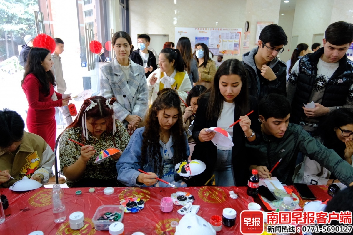 ▲不少留学生在认真画脸谱。