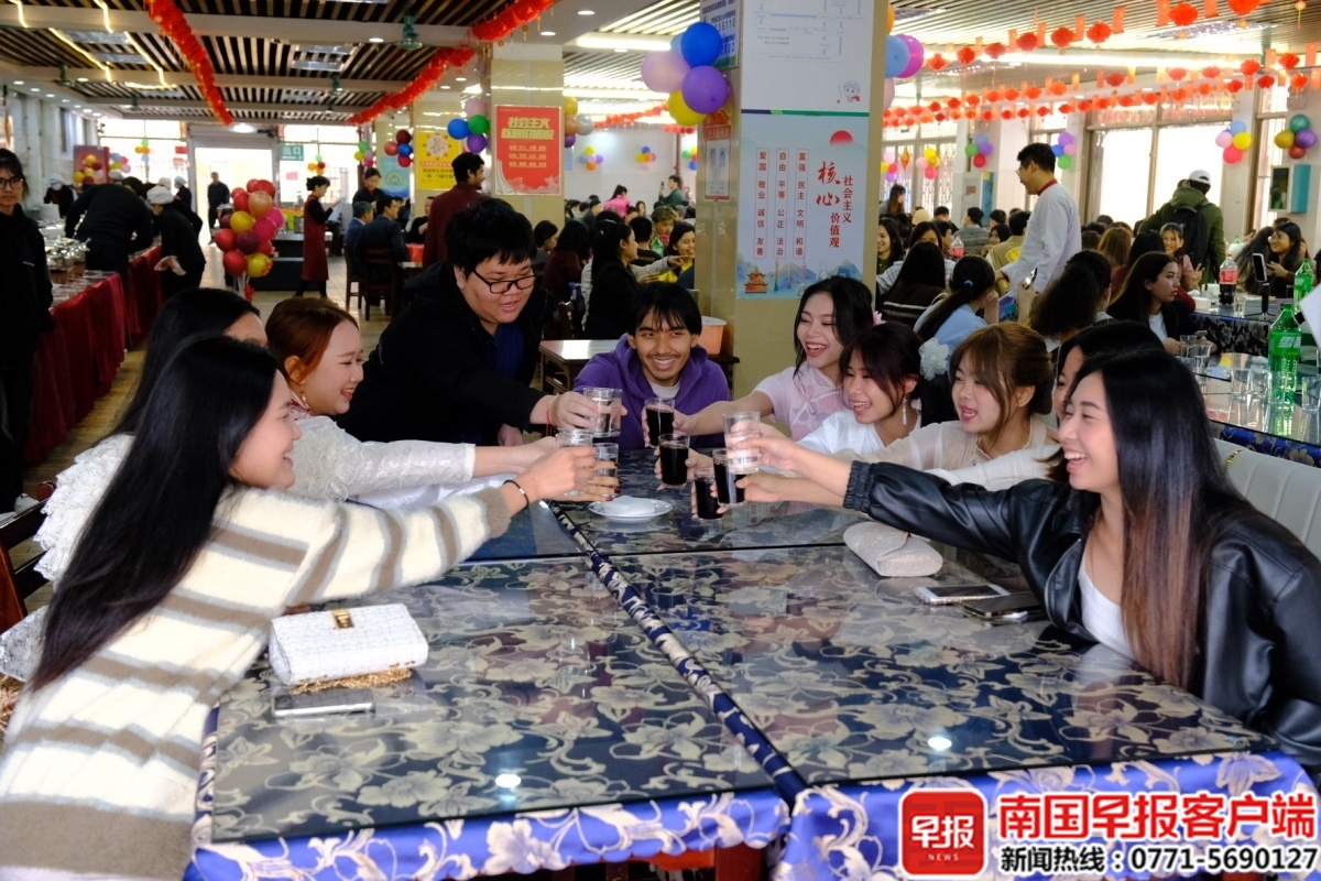 ▲留学生在餐厅开展庆祝活动。