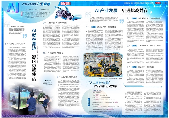 推动“人工智能+”赋能千行百业,广西正在积极行动。业内人士期待,广西尽快落地支持人工智能行业发展的政策,加大算力基建投入,培育引进领军企业和人才,加强上下游对接合作,形成完整产业链。