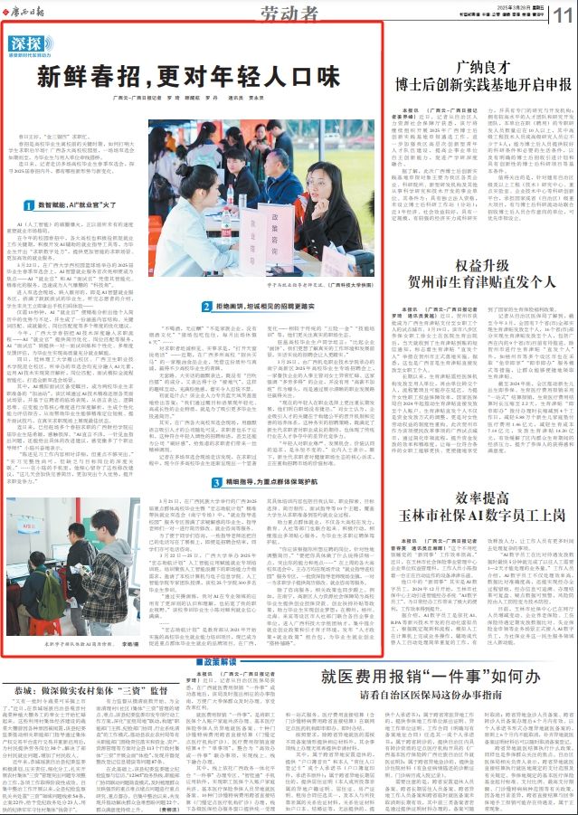 同日,桂林理工大学雁山校区、广西卫生职业技术学院昆仑校区,所举办的双选会均充分融入AI元素,运用AI技术实现简历解析,岗位匹配、面试模拟全流程智能化,打造全新双选会场景。