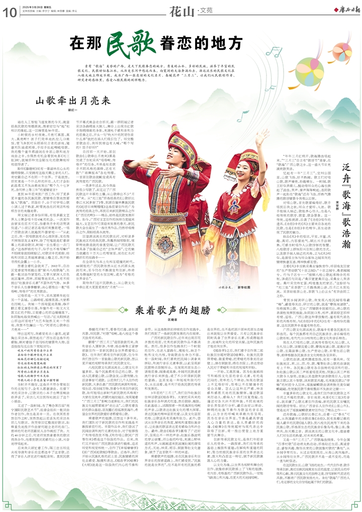 回望源远流长的民歌长河,对标诸多民族地区的经典民歌,我蓦然间领悟到,喀斯特地貌造就的垂直空间,让广西民歌天然具备了独属自己的“立体声场”,它的魅力就藏在十万大山的褶皱里,刻在红水河鹅卵石的纹路中……