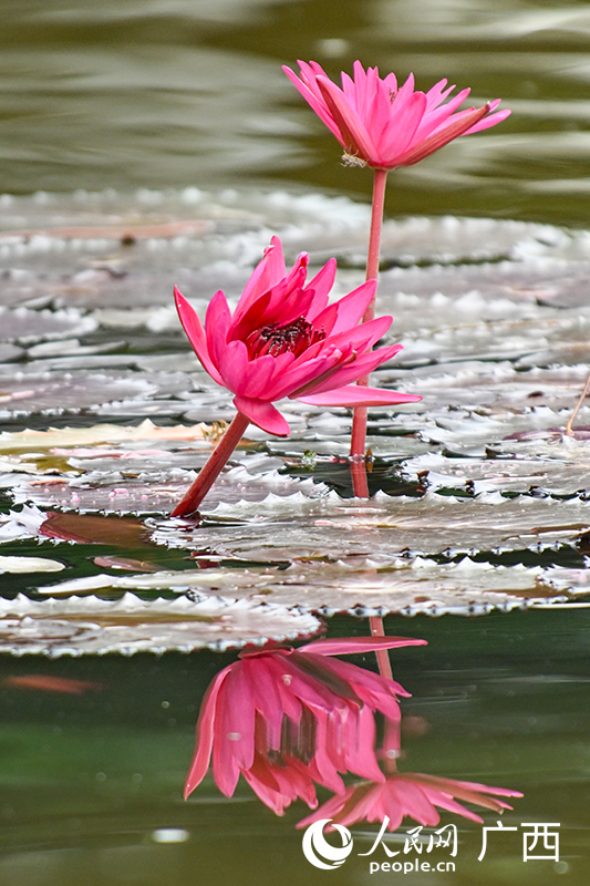 据介绍,“同心莲”与“并蒂莲”对水温、光照、水质等生长条件要求苛刻。但花期只有6至7天,而且只在每日6:00—9:00绽放。(雷琦竣、韦俞妃)