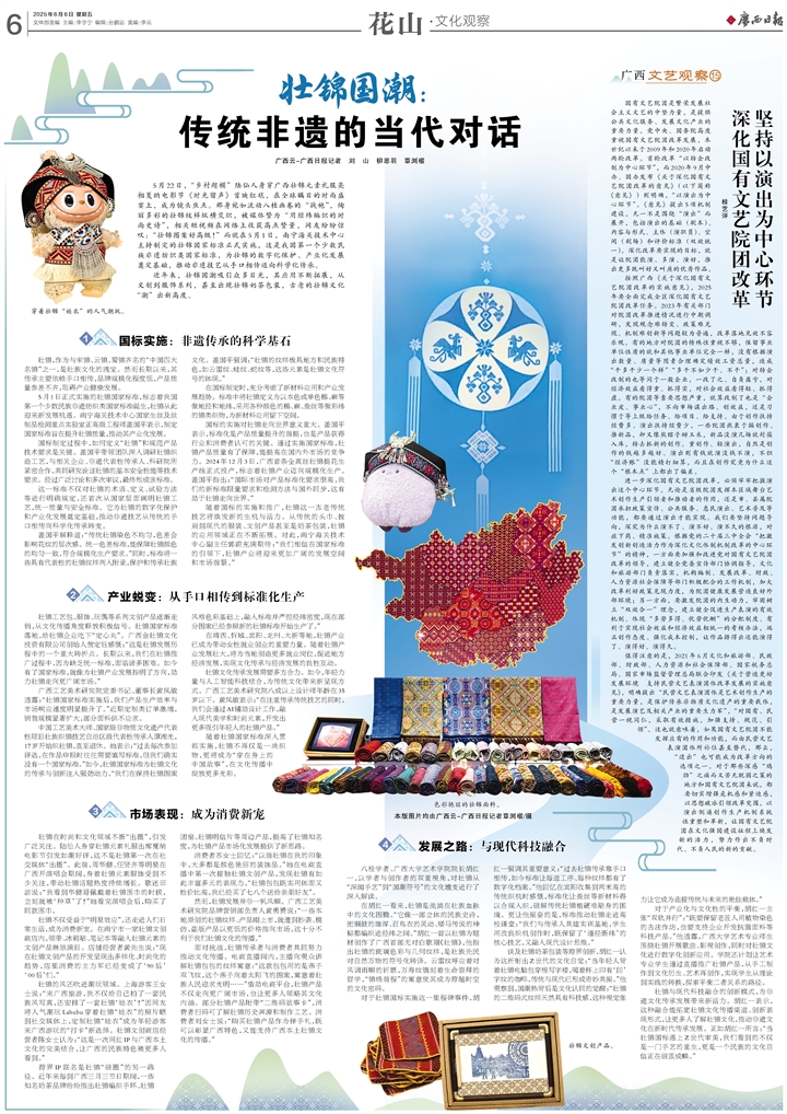 广西工艺美术研究院党委书记、董事长黄凤敏透露:“壮锦国家标准实施后,我们产品生产效率与市场响应速度明显提升了。”近期定制类订单激增,销售规模显著扩大,部分面料供不应求。