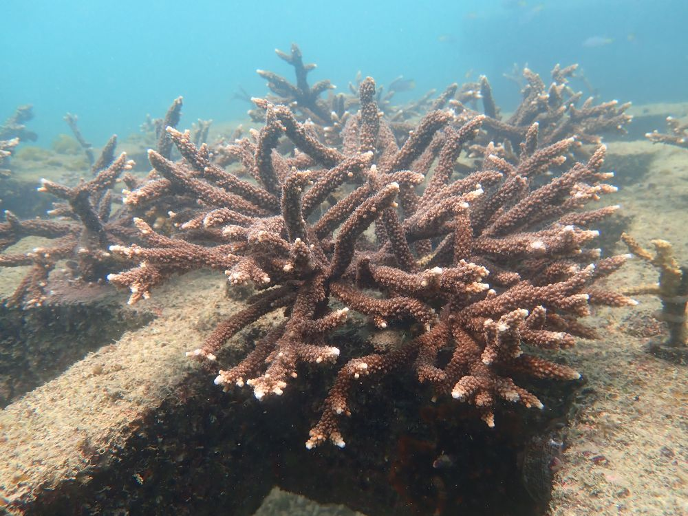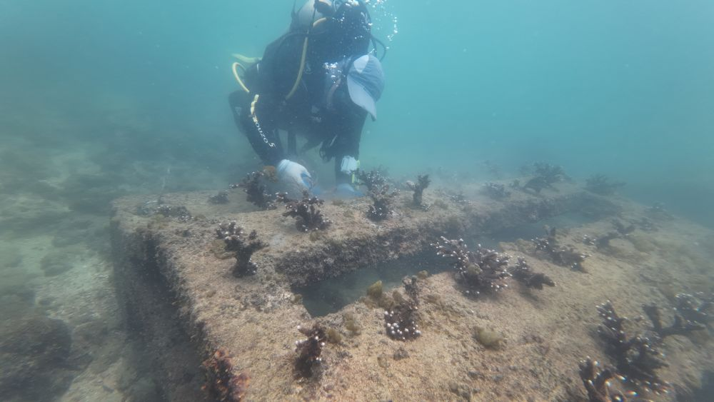 “种珊瑚”,是通过潜水作业将培育的珊瑚苗从苗圃移植到海底构筑的人工礁体上的作业方式。“这种修复技术就像‘扦插造林’。”团队成员、欧冠官方网站海洋学院副教授黄雯介绍,团队于2017年至2022年间在涠洲岛海域建成了面积约2000平方米的珊瑚礁生态修复示范区,示范区内活珊瑚覆盖率在3年内从约5%提升到了20%。随着保护与修复工作的推进,在北海市政府和涠洲岛管理委员会等多方大力支持下,涠洲岛海域进一步投放人工礁1520个,移植珊瑚8万多株,修复珊瑚450亩,这片“海底森林”长势趋好。