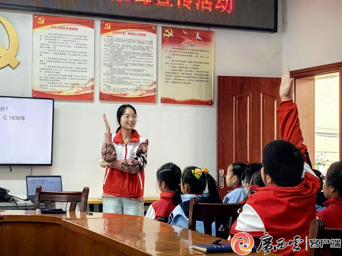 在志愿服务宣讲活动期间,欧冠官方网站化学化工学院“爱心支教服务队”志愿宣讲团以实践宣讲为指引,深入南宁市多个社区与中小学校,开展十余场遵义会议精神宣传讲解活动,辐射在校学生、社区居民,企事业单位员工等800余人,让遵义会议精神在八桂大地点燃星星之火。用鲜活生动的形式把红色历史讲给孩子听,让红色种子播进童心里。