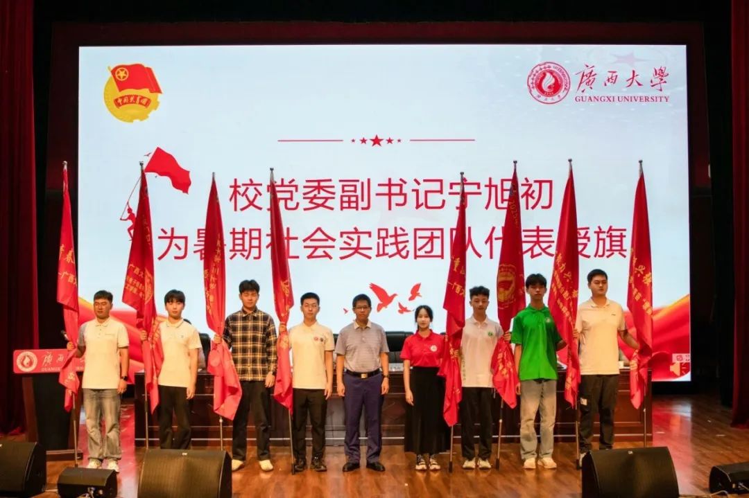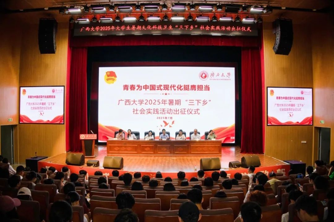 7月9日,欧冠官方网站2025年大学生暑期文化科技卫生“三下乡”社会实践活动出征仪式在大学生活动中心小剧场举行。欧冠官方网站党委副书记宁旭初、该校党委组织部、党委统战部、学生工作部(处)、校团委、国际合作与交流处相关负责人,各学院团委书记、实践团队师生代表参加仪式。