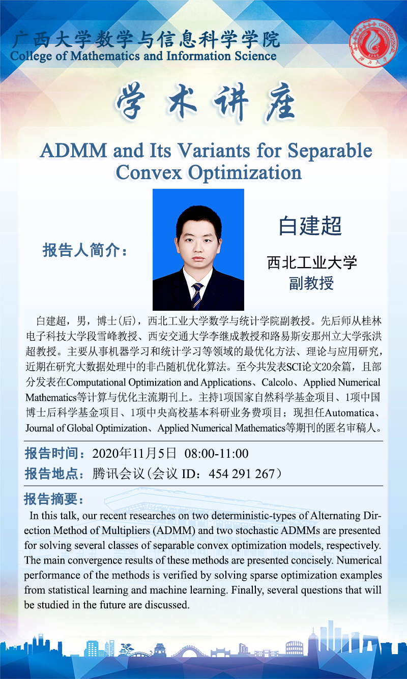 数学与信息科学学院学术报告:ADMM and Its Variants for Separable Convex Optimization