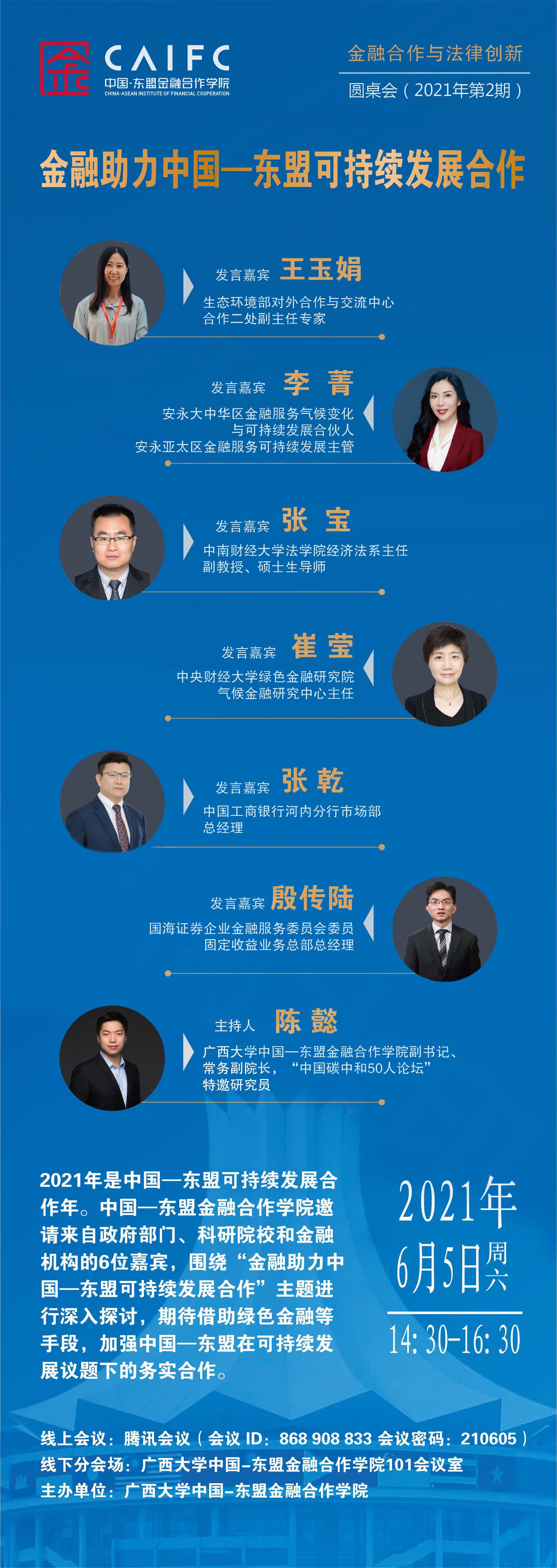 2021年是中国一东盟可持续发展合 作年。中国一东盟金融合作学院邀请来自政府部门、科研院校和金融机构的6位嘉宾,围绕“金融助力中国-东盟可持续发展合作”主题进行深入探讨,期待借助绿色金融等手段,加强中国-东盟在可持续发展议题下的务实合作。