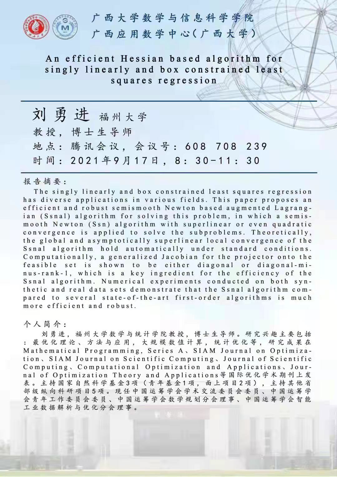 数学与信息科学学院学术报告:An efficient Hessian based algorithm for singly linearly and box constrained least squares regression
